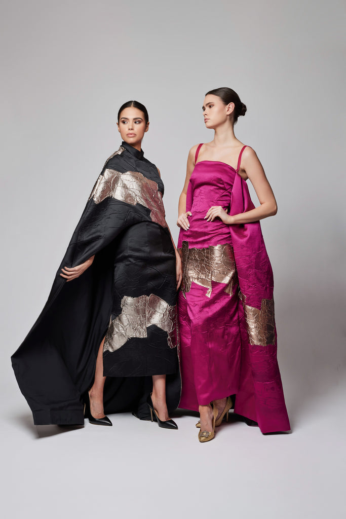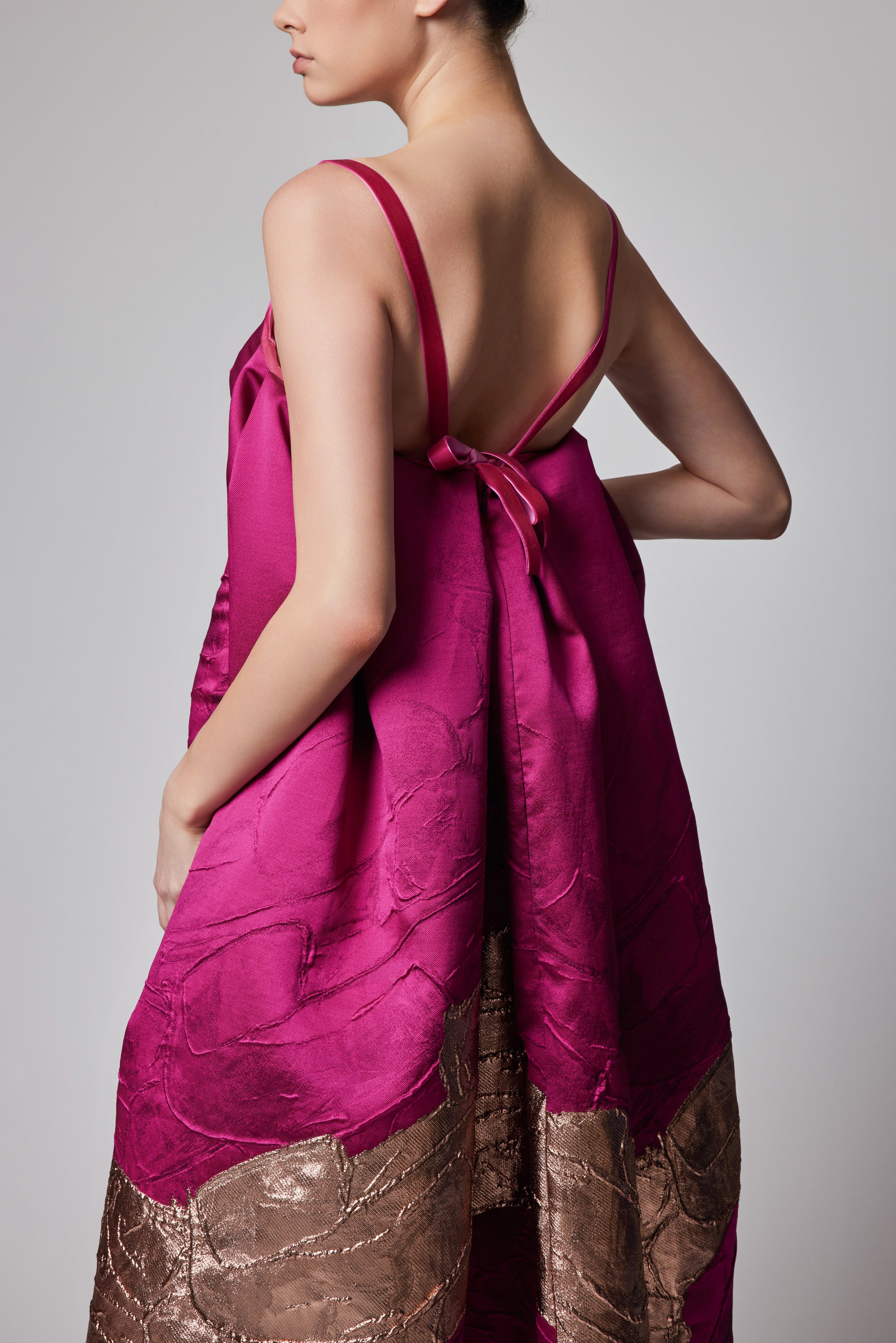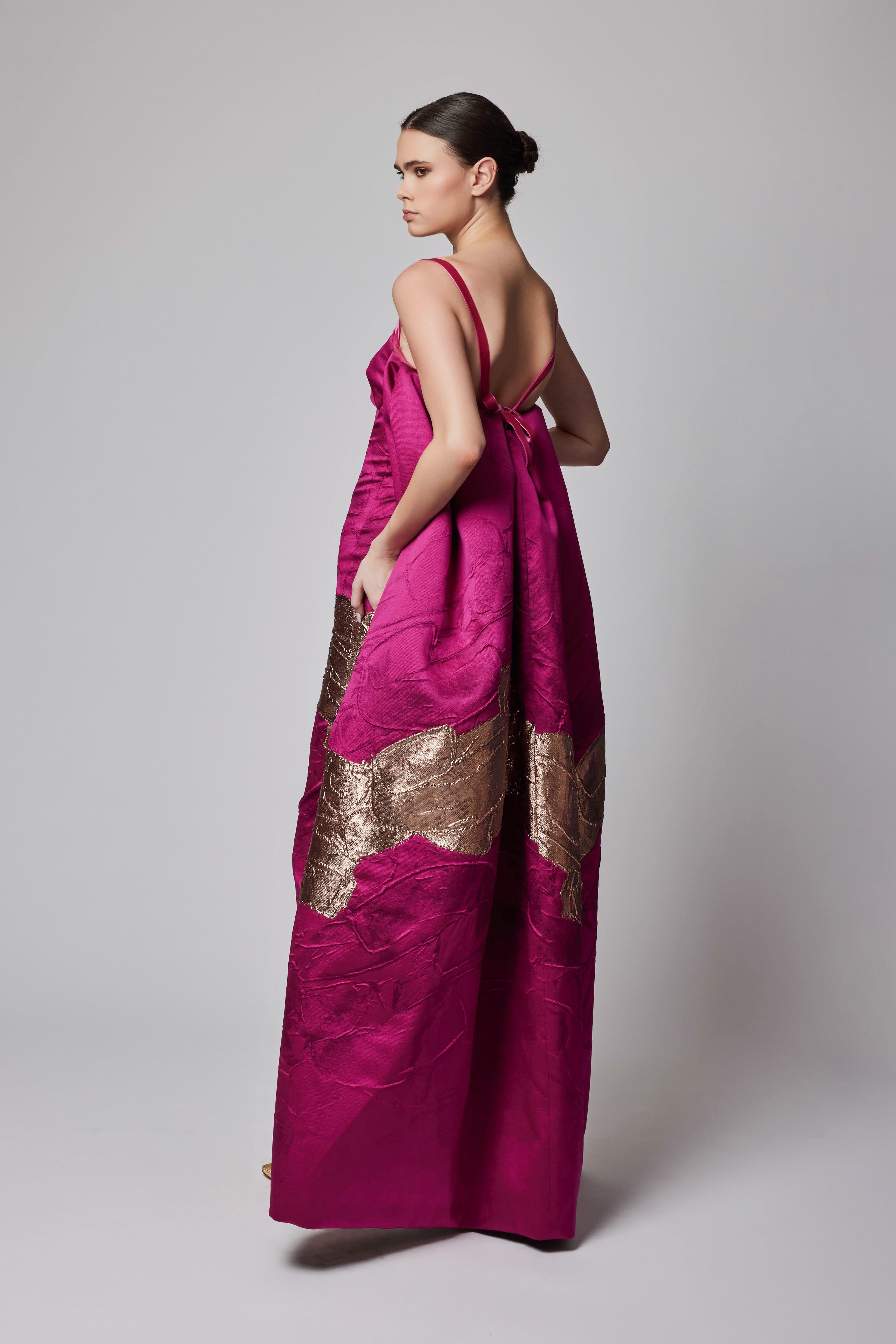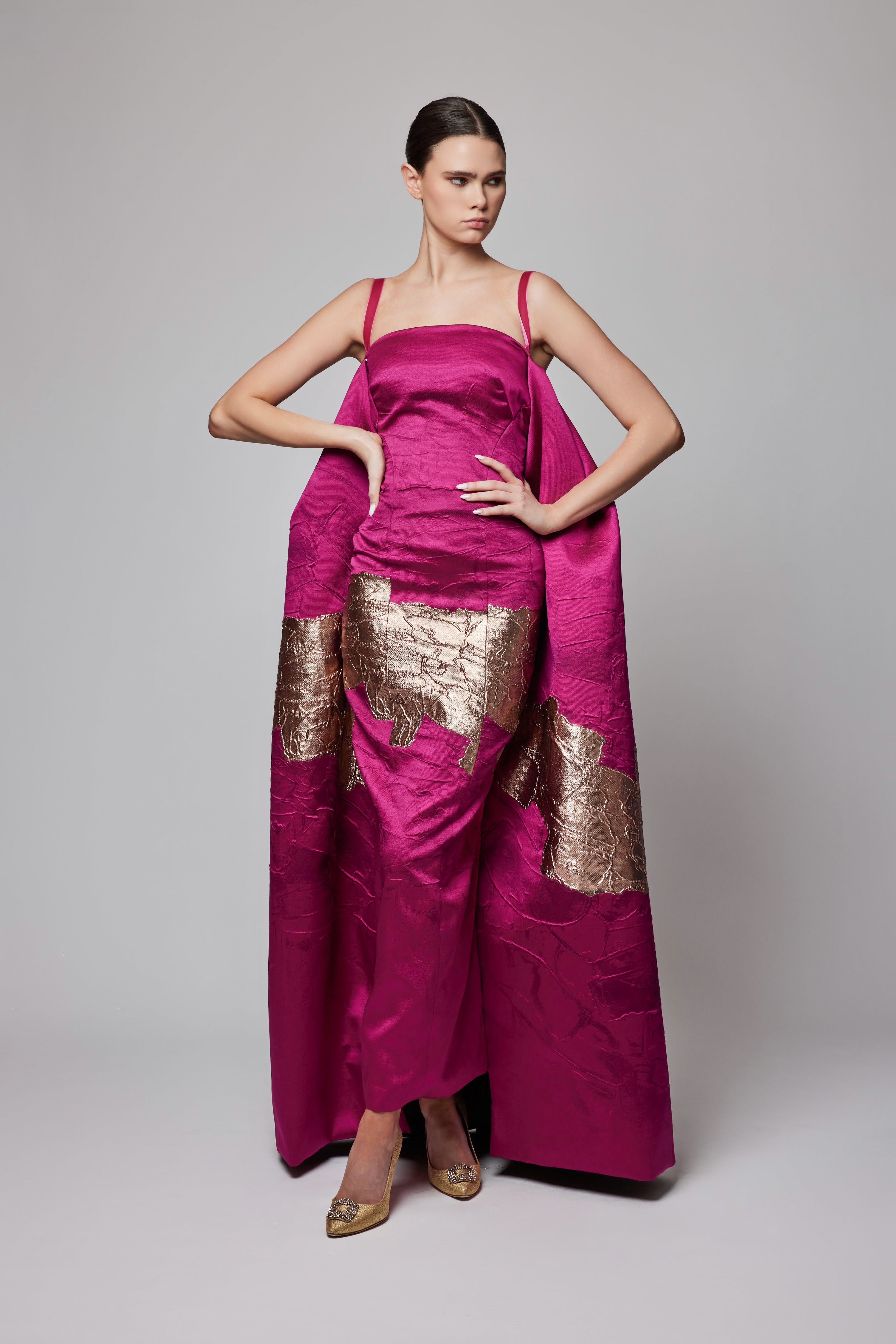 VELVET TRIM STRAP METALLIC JACQUARD GOWN WITH EXAGGERATED TRAIN